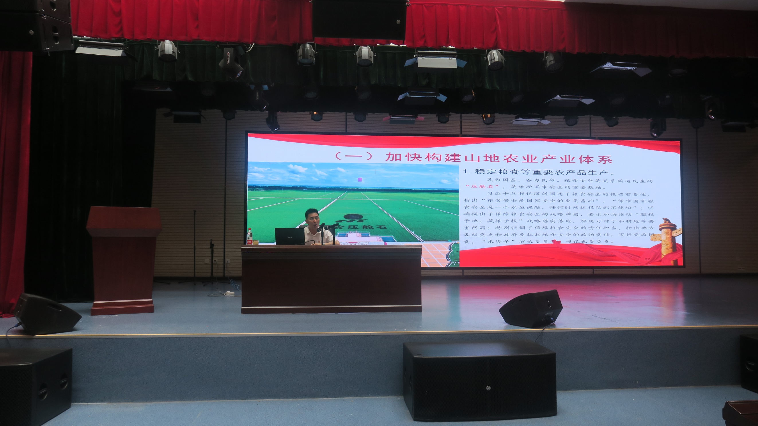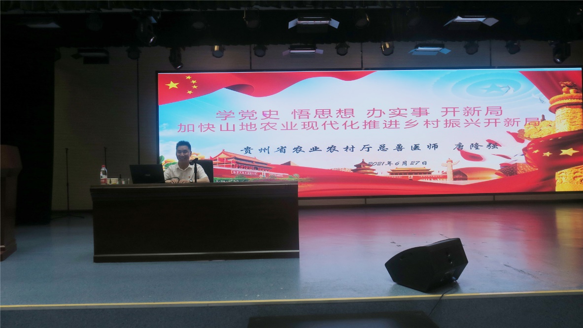 唐隆强总兽医师以“学党史、悟思想、办实事、开新局,加快山地农业现代化推进乡村振兴开新局”为题,紧扣当前实际,围绕“三农”问题是全党全省工作重中之重、加快山地农业现代化、推进乡村振兴开新局、畜牧兽医渔业大有可为等方面为师生党员讲授了生动严肃的党课。他表示,党的奋斗征程始终与“三农”密不可分,在党中央和省委的高度重视下,我省的“三农”工作在近几年取得了明显的成效,但仍存在很多不足,因此要认真落实习近平总书记在春节前夕视察贵州时对贵州提出的“四新四化”要求,走出一条有别于东部、不同于西部其他省份的发展之路,加快山地农业现代化建设,努力开创百姓富生态美的多彩贵州新未来。
