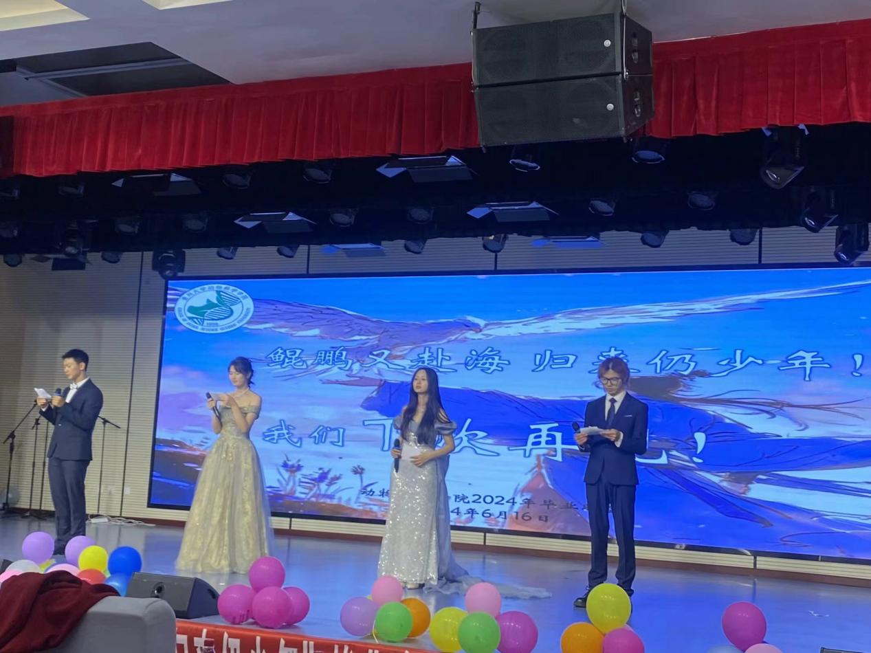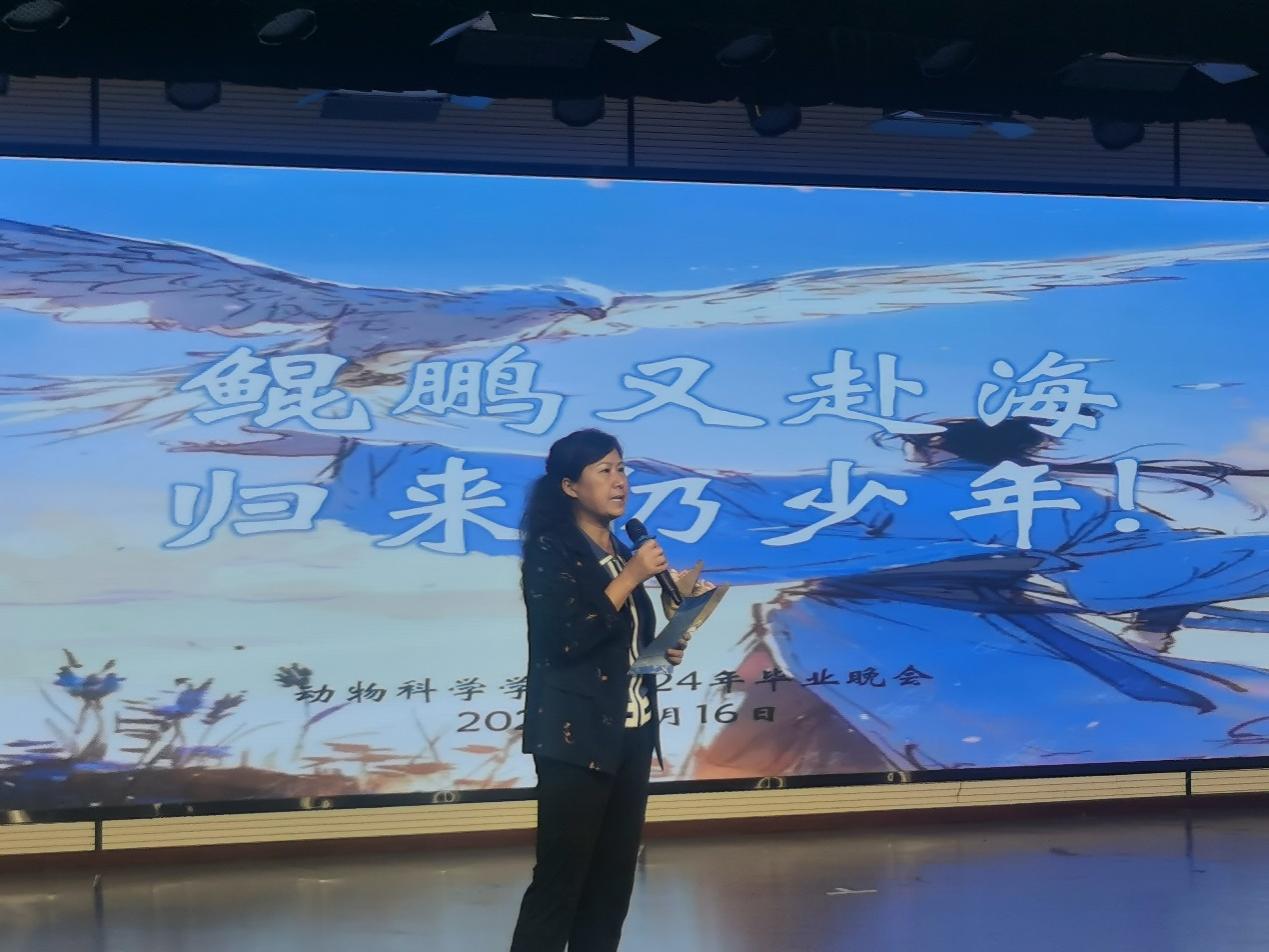 随着音乐响起,毕业晚会拉开帷幕。無章乐队的《西湖》和《春风十里》以悠扬的旋律开启音乐篇章,带领大家进入一个充满诗意的音乐世界。紧接着,X-ray艺术团以动感十足的舞蹈《Next Level》点燃现场气氛;动科2202班的小品《动物王国》为大家带来欢笑,用幽默的方式介绍了我们学院的动物科学、动物医学、草业科学、水产科学4个本科专业的特色;在毕业班班主任王惟惟老师深情演绎的《我们走过的路》中,我们回顾过去的日子,感受那些美好的瞬间;动医联盟的配音表演《甄嬛传-学术篇》为大家带来了欢笑,将晚会推向了高潮。
