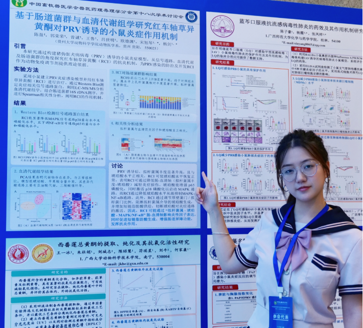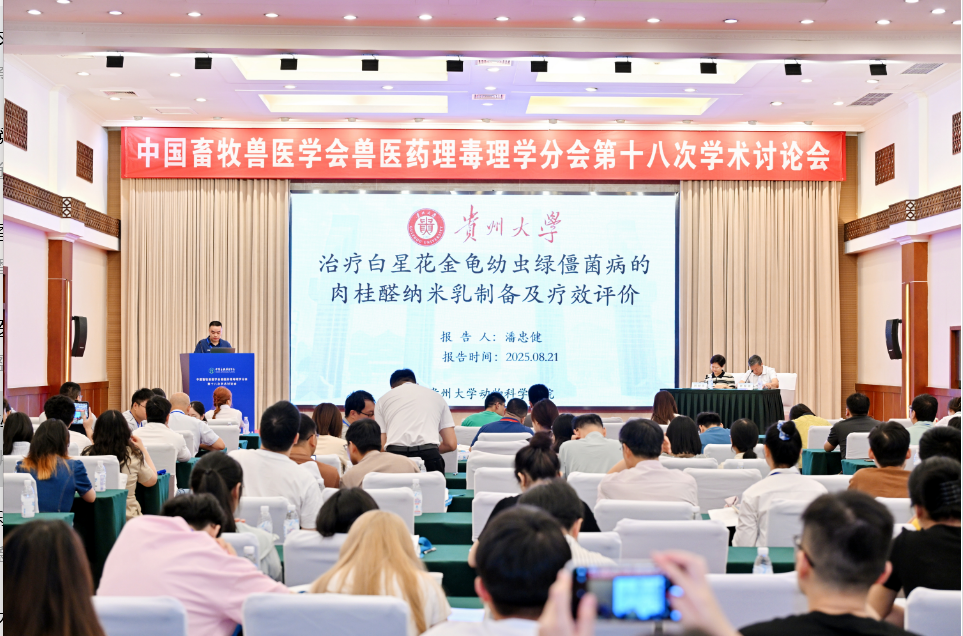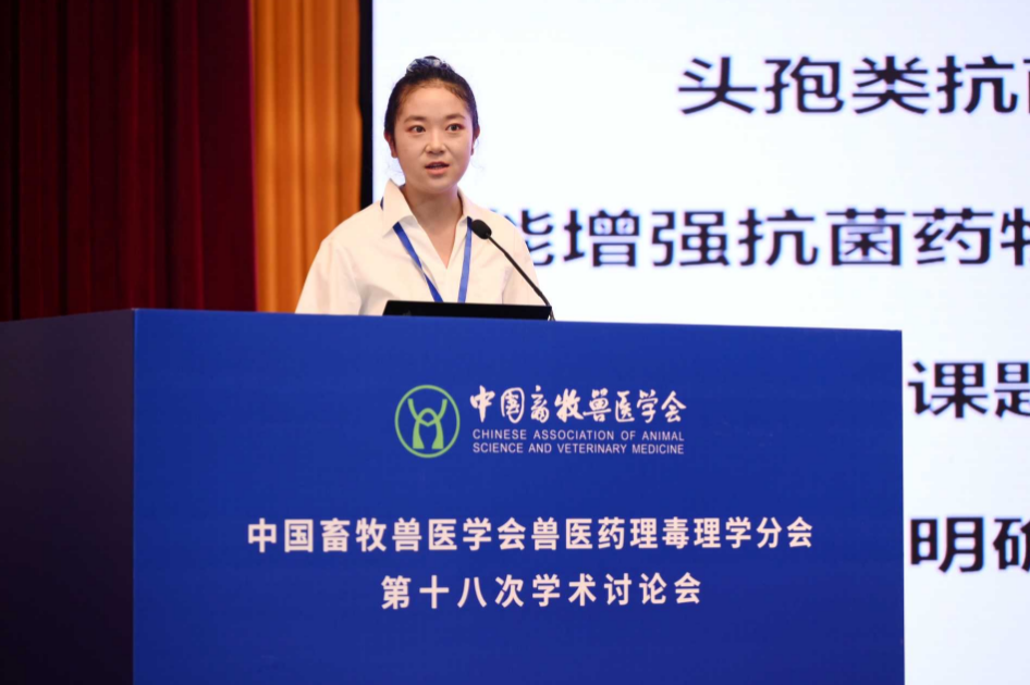 与会期间,兽医药理学实验室研究生潘忠健、魏岩分别以“治疗白星花金龟幼虫绿僵菌病的肉桂醛纳米乳制备及疗效评价”和“牡荆素协同头孢噻呋抗鸡源多重耐药大肠杆菌的作用机制”作大会报告,吴俊杰、陈盈在主会场作壁报交流。重点介绍了英国威廉希尔官网师生在遏制细菌耐药性和研发新兽药防治动物疾病方面开展的工作和取得的成果。